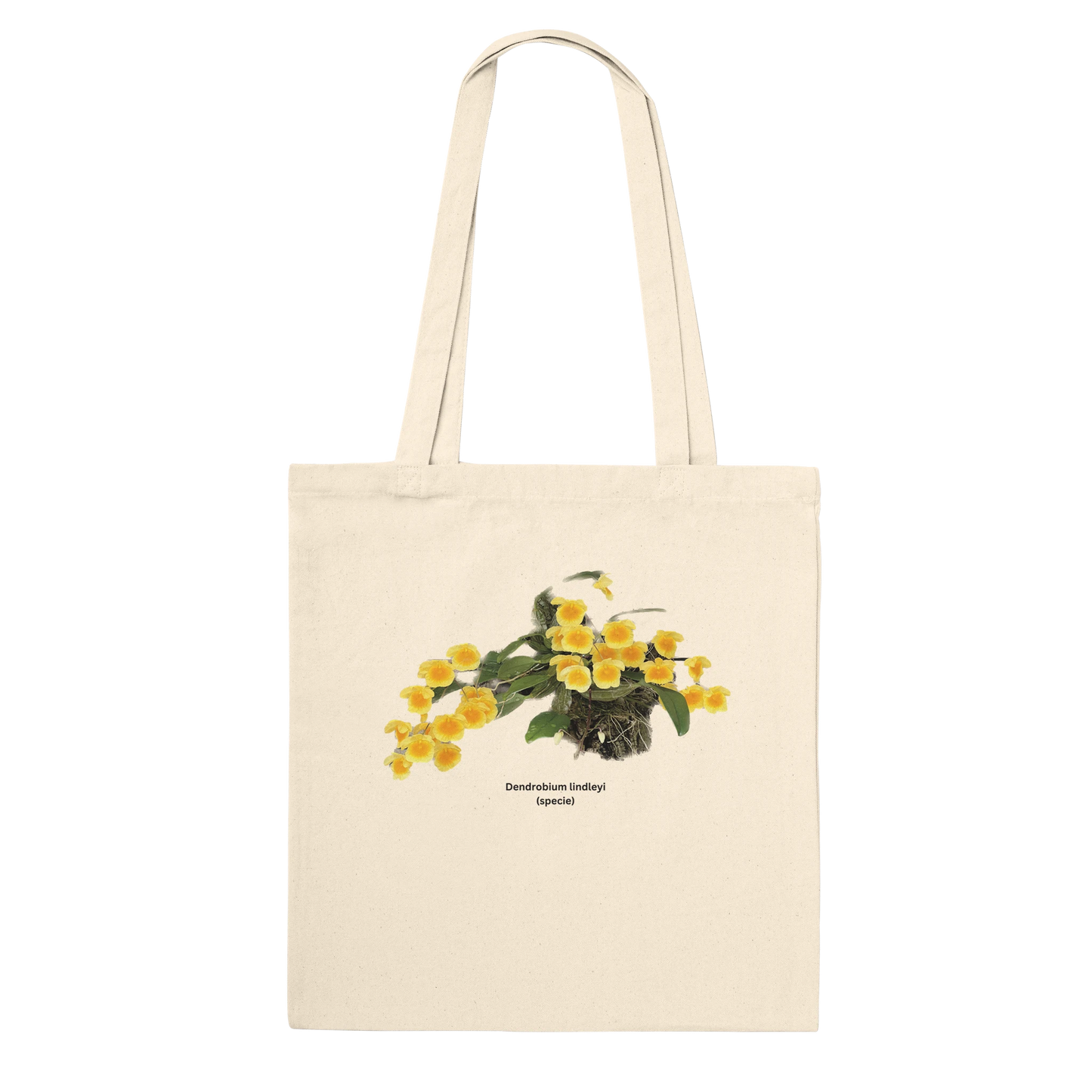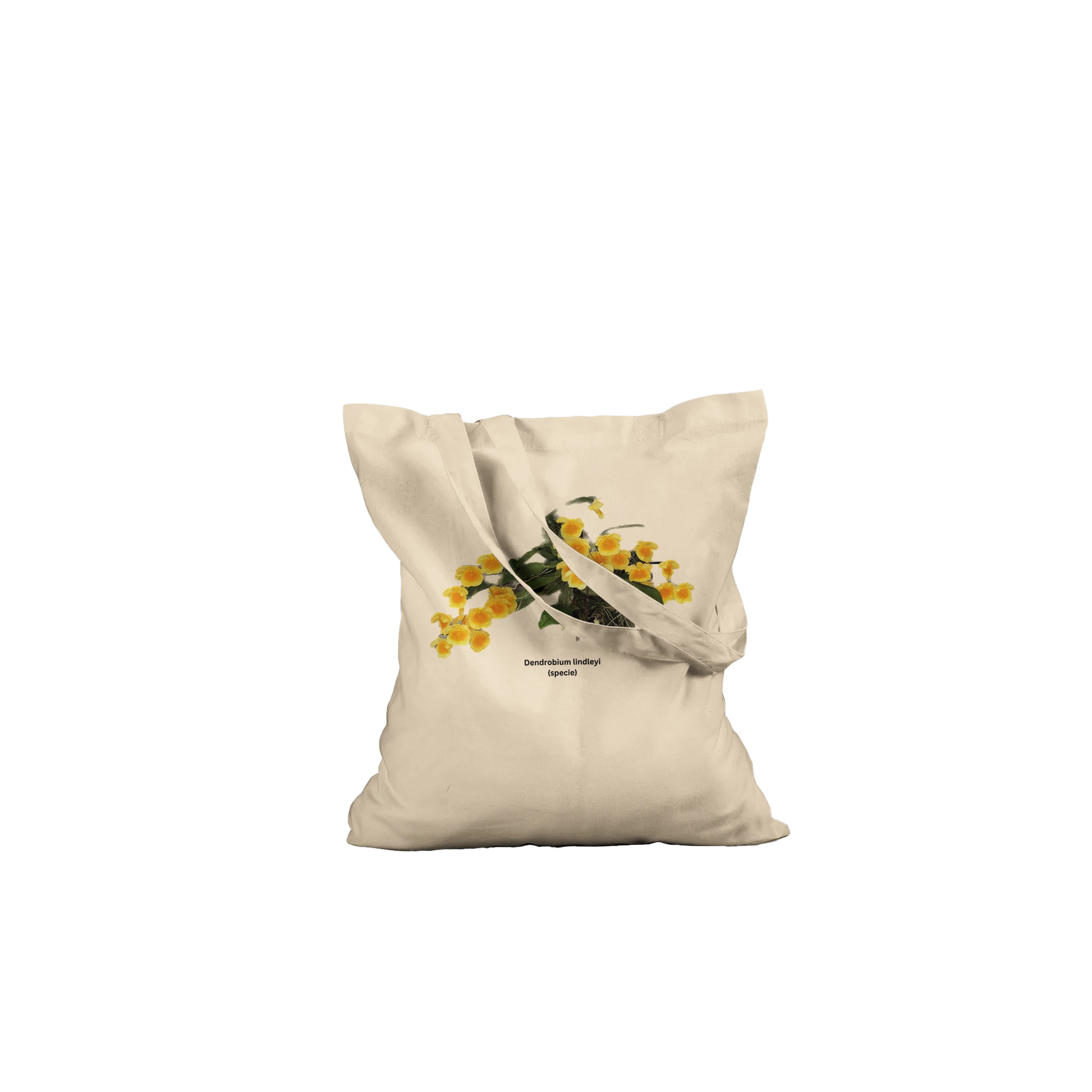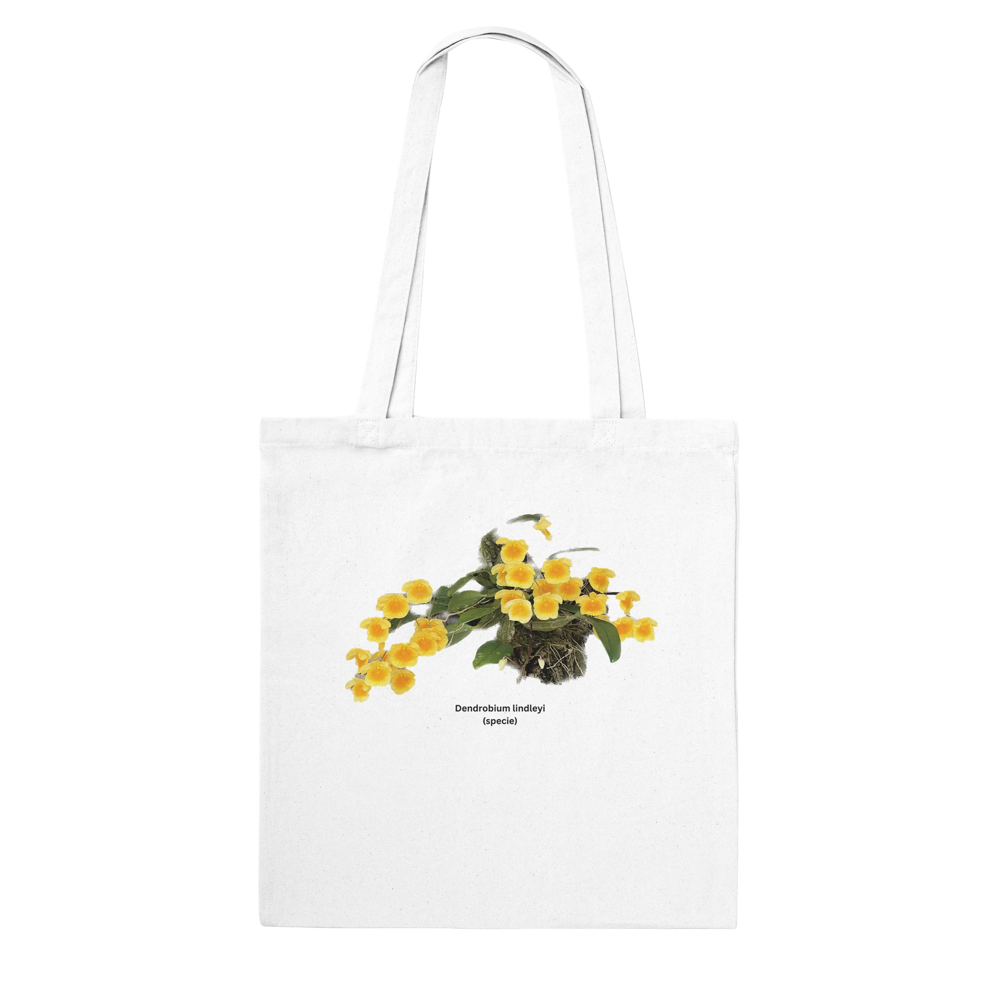 Featuring a vibrant print of the Den. lindleyi orchid, renowned for its intricate blooms, this tote bag is crafted from durable, eco-friendly materials.