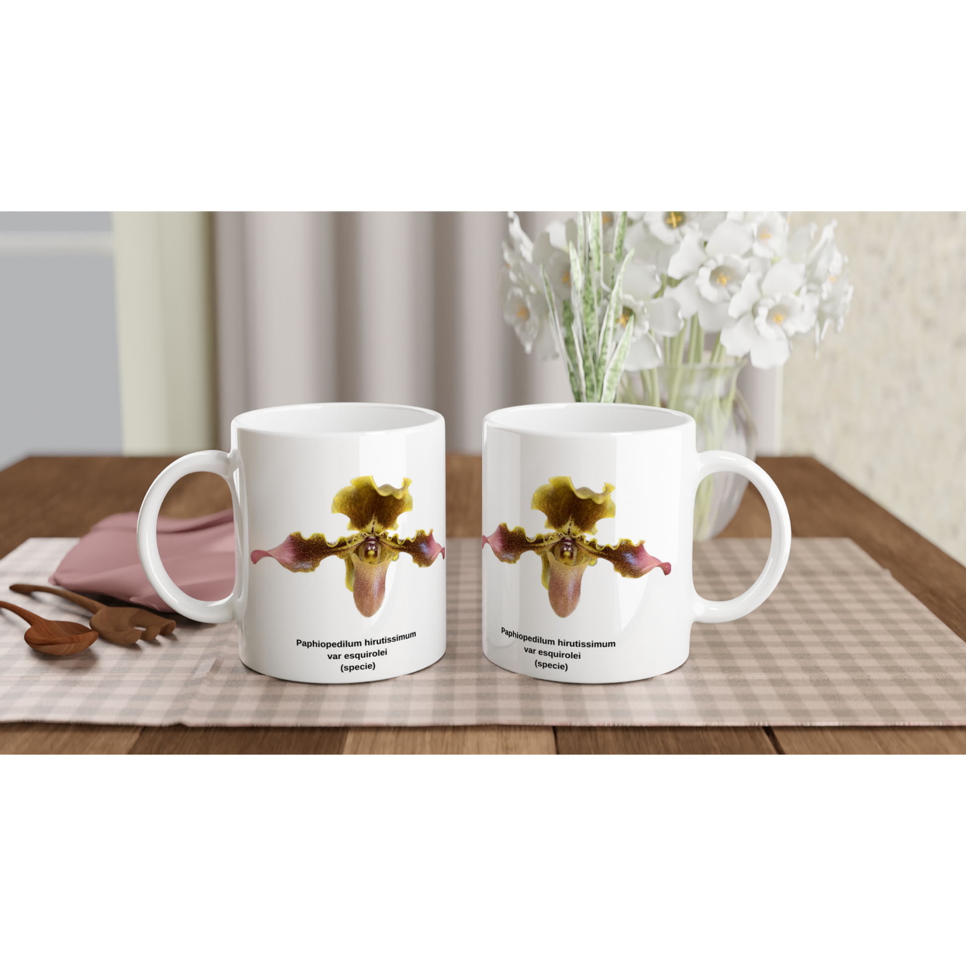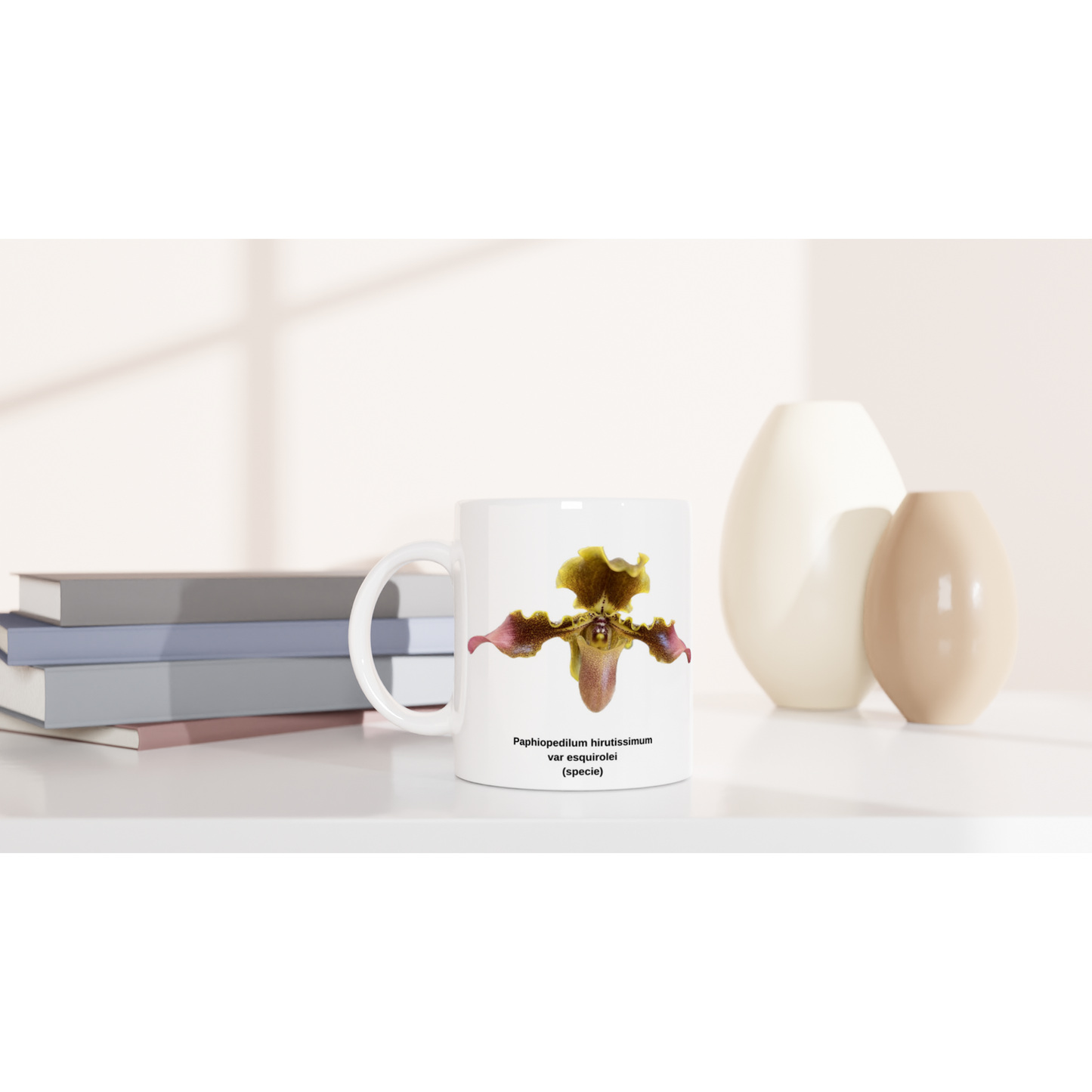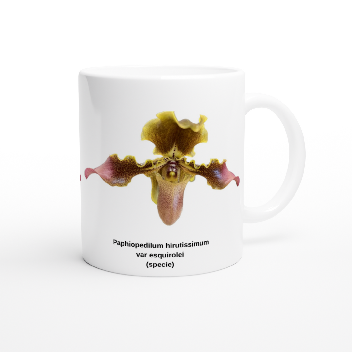 Perfect Gift - The Paphiopedilum hirsutissimum var esquirolei Orchid coffee mug is a perfect gift for people who also love and enjoy orchids. It is also great for orchid or garden club/societies raffles prizes, show prizes and annual awards prizes.