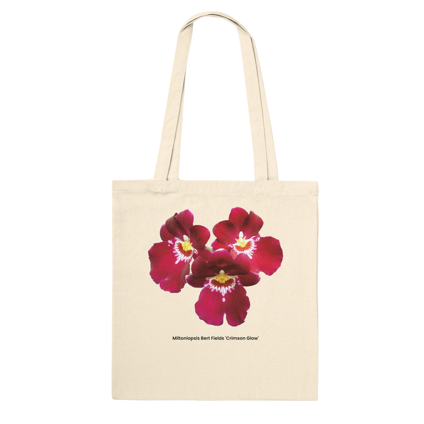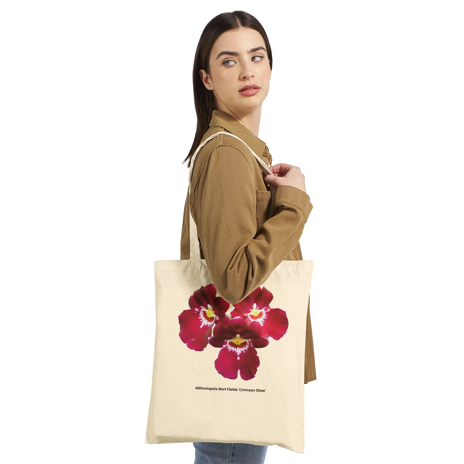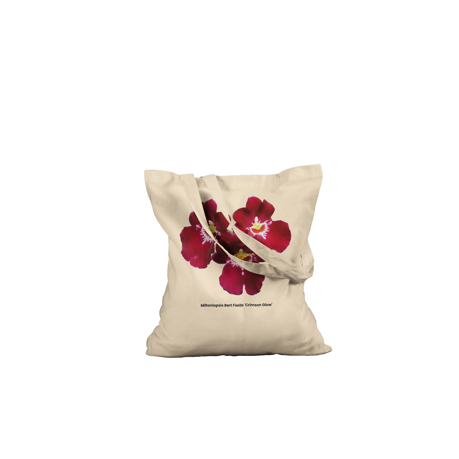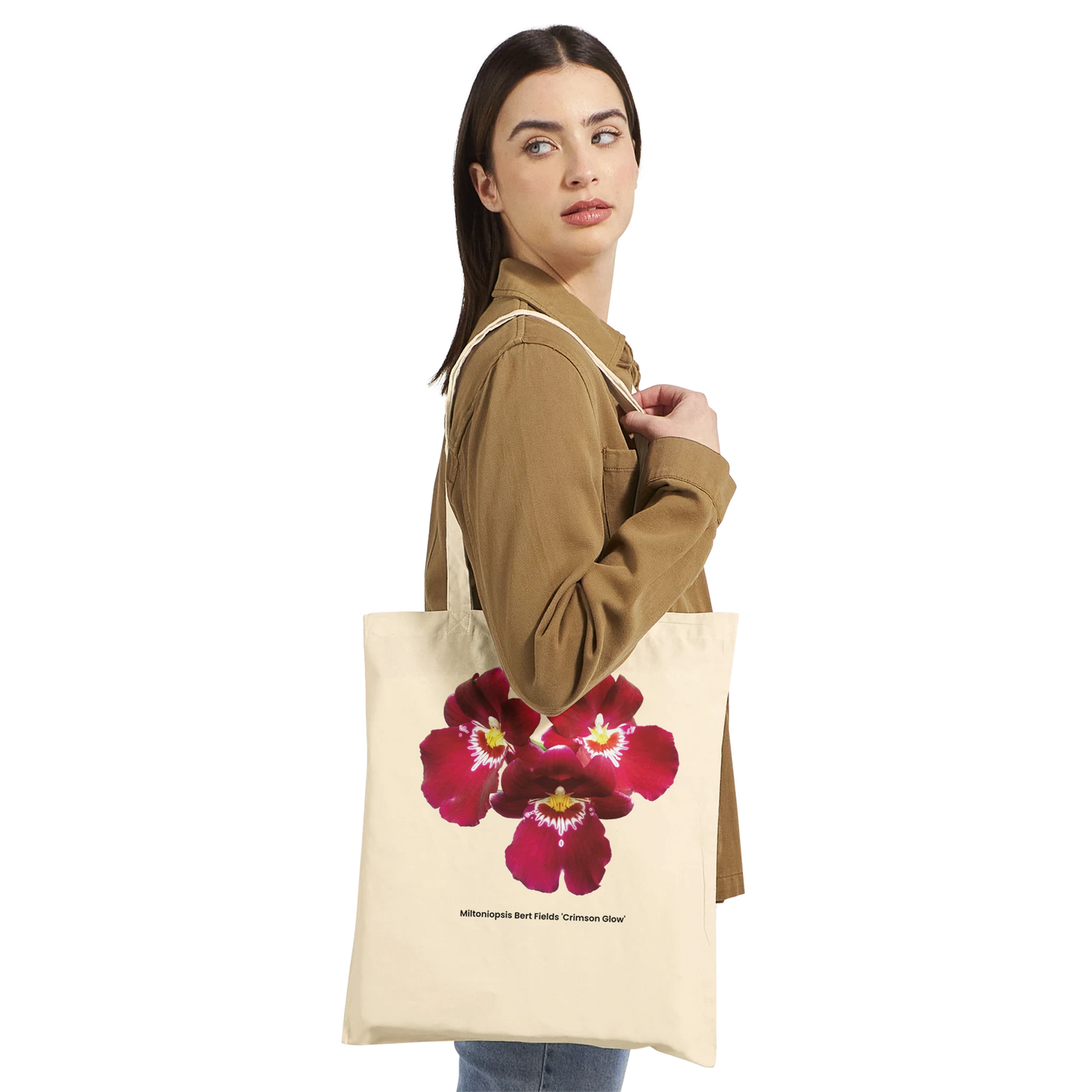 The Miltoniopsis Bert Fields 'Crimson Glow' tote bag is a practical, high-quality bag, with a beautiful orchid print. It is a great way for you to show your passion for orchids. They are available in three sizes, providing comfort with style, at the beach or, out in town.